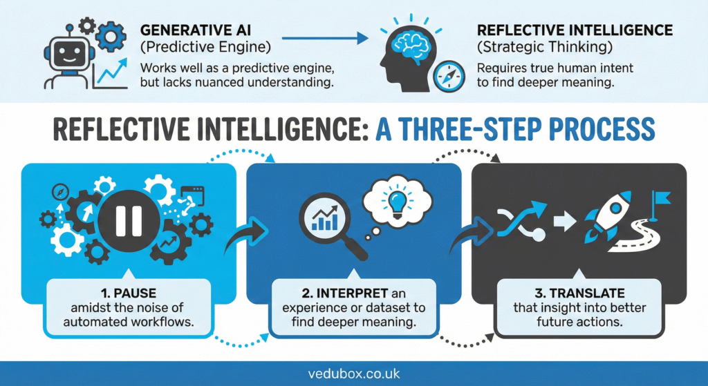 Generative AI works well as a predictive engine, but it lacks the nuanced understanding that requires strategic thinking and true human intent. In this context, reflective intelligence refers to the ability to undergo a three-step process.