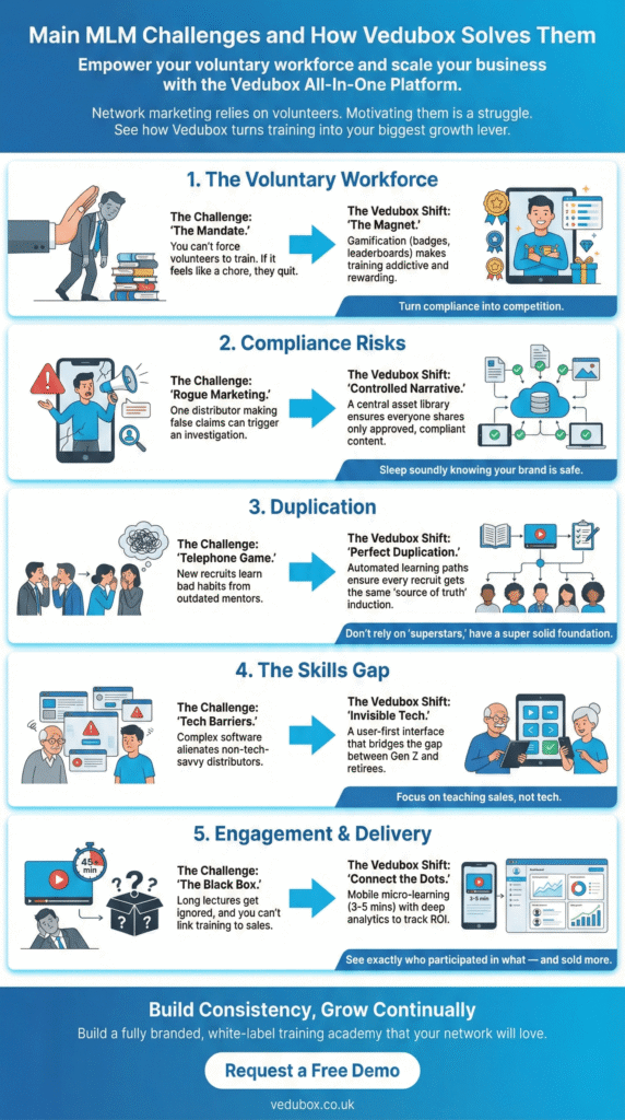 MLM companies often face five persistent challenges. Vedubox offers a flexible and scalable platform designed to help teams overcome these obstacles with thorough sales training.